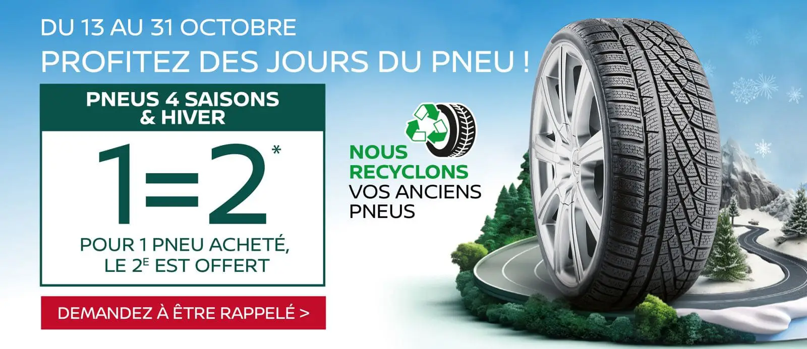 Offre valable sur tous les pneumatiques 4 saisons et hiver, des marques Continental, Goodyear, Dunlop, Bridgestone et Pirelli, pour les clients particuliers propriétaires de véhicules Nissan, du 13/10/2025 au 31/10/2025, dans la limite des 8000 premiers pneumatiques vendus, auprès des concessionnaires NISSAN participants.
